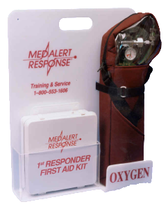 This is our basic emergency response setup. It is to be used in any accident or injury where the victim is still breathing on their own. This system is designed to be wall mounted for easy access. The MIC Emergency Oxygen unit is designed for use by anyone so that life saving oxygen can administered to a victim of accident or injury. The “First Responder” 1st Aid Kit is not your basic 1st Aid kit! This portable kit contains individually packaged components ready for use in cases of burns, eye injury, bleeding etc.